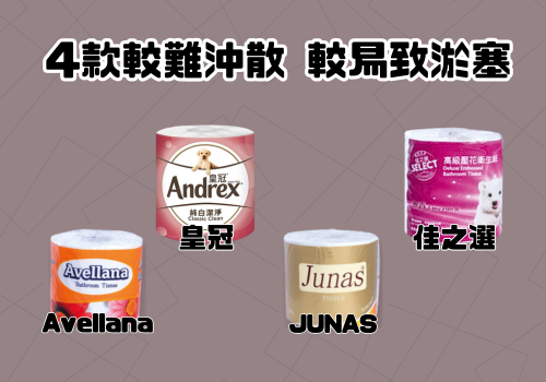 消費者委員會曾經測試了市面25款卷裝廁紙,結果發現當中4款較難在水中分解。這些包括「皇冠」純白潔淨3層衛生紙、「Junas」高級5層衛生紙、「佳之選」高級壓花衛生紙無香及「Avellana」Bathroom Tissue。測試顯示,這些產品在濕水時呈現較高的抗拉強度,若使用量過多,加上沖廁水量不足,極易造成渠道淤塞。消委會建議市民在選購廁紙時,應留意產品的分解性能,並適量使用。