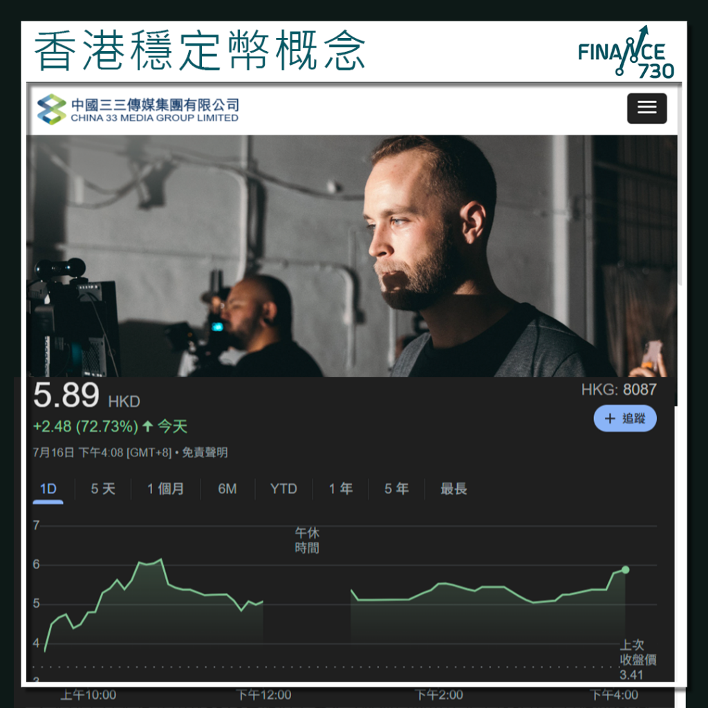 穩定幣概念股熱炒|中國三三傳媒(8087)於7月15日發布自願公告,宣布集團擬申請香港穩定幣牌照。消息公佈後,公司股價大幅上揚,收報5.89港元,較前一交易日上升72.7%,股價創3年新高,成交金額達2,480萬港元。