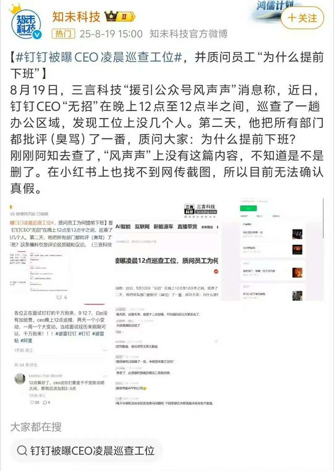 至今年年初阿里收購「兩氫一氧」,陳航回歸釘釘擔任CEO,基於期望員工重返「創業狀態」,開始著力「整頓職場」:開早會、上班禁止玩手機、禁止上班時間看微信、微博和小紅書等。