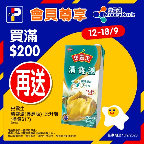 消費滿$200或以上,再送史雲生清雞湯1公升裝(總值$17)