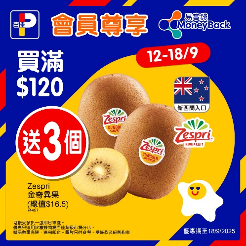 會員單次消費滿$120或以上,即送Zespri金奇異果3個(總值$16.5)