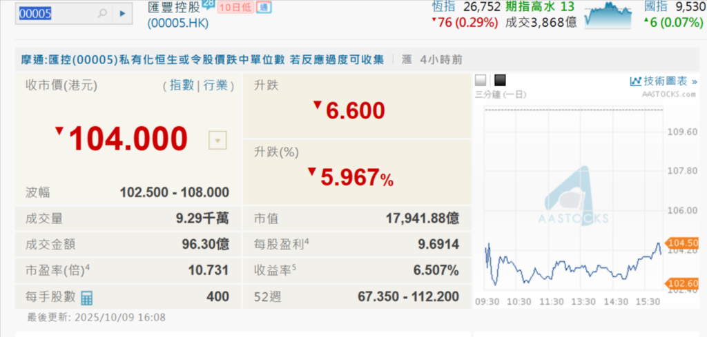 受消息影響,滙控股價今日收報104元,跌5.97%,成交金額96.3億元;恒生股價收報149.8元,升25.9%,成交金額84.49億元。