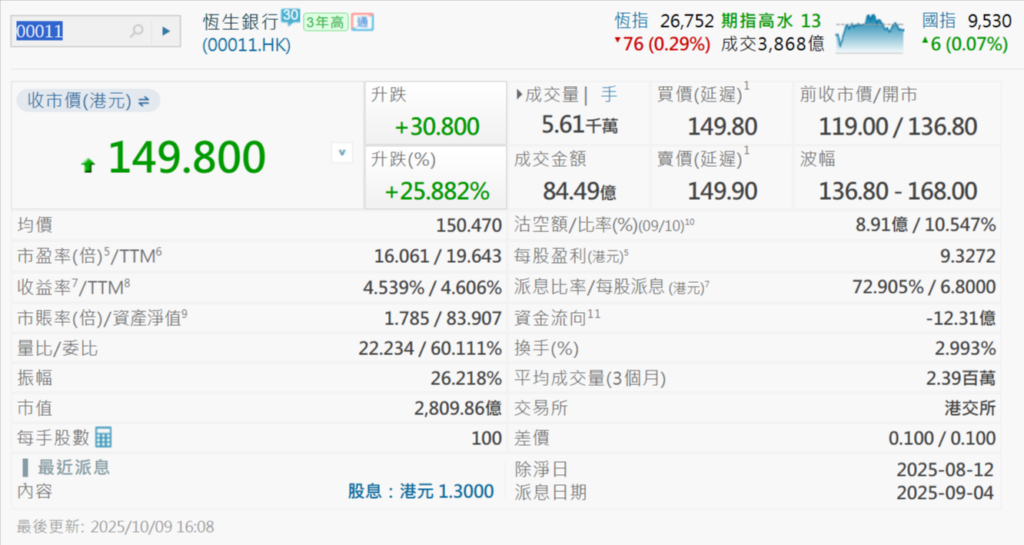 滙豐指,私有化作價相當於2025上半年度市賬率1.8倍 (實際及未經審核數字),對比香港可比同業公司中位數 (0.4 倍) ,較恒生銀行上日(8日)收市價119元溢價約30.3%。滙豐表示,私有化計劃對價將不會提高,滙豐控股及滙豐亞太亦不保留提高計劃對價的權利。
