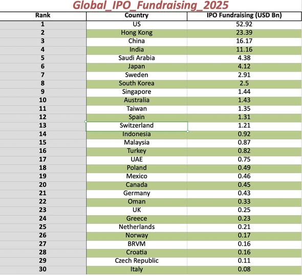 上半年,倫敦交易所已跌出全球前十,我當時形容這項狀況相當嚴重,但最新數據顯示,倫敦交易所的IPO排名已降至全球第23名。這不僅比許多主要金融市場差,甚至一些新興市場如馬來西亞和阿曼也都超過了倫敦。新加坡今年升至全球第九位,而墨西哥也超越了倫敦,以4,600萬美元的集資排名第十九,幾乎是倫敦的兩倍。值得注意的是,去年的墨西哥金融市場幾乎沒有IPO活動。