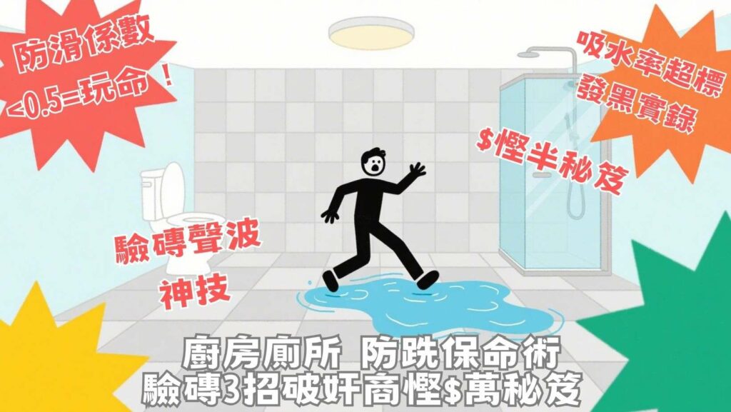 鋪地磚唔單止係美感之爭,更係全家安全生死戰!廚房亮面磚遇水變瀡冰場、廁所吸水率超標養霉菌、陽台劣質磚凍融爆裂——中伏案例血跡斑斑。本攻略從 5大空間保命選磚法 切入,揭密廚衛防滑係數≥0.5黃金線,獨家傳授聲波驗磚三招破奸商幻術,加碼混鋪慳$11000秘技。睇完即刻避開索命陷阱,靚屋企唔使攞命博!
