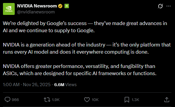 與此同時外媒周二報導指Meta正考慮旗下數據中心大規模採用Google自研的AI晶片TPU( Tensor Processing Unit張量處理單元,專門為人工智慧運算打造的晶片),而NVDA則在社交媒體X發帖,宣稱其GPU技術「領先行業一代」,以回應市場憂慮。