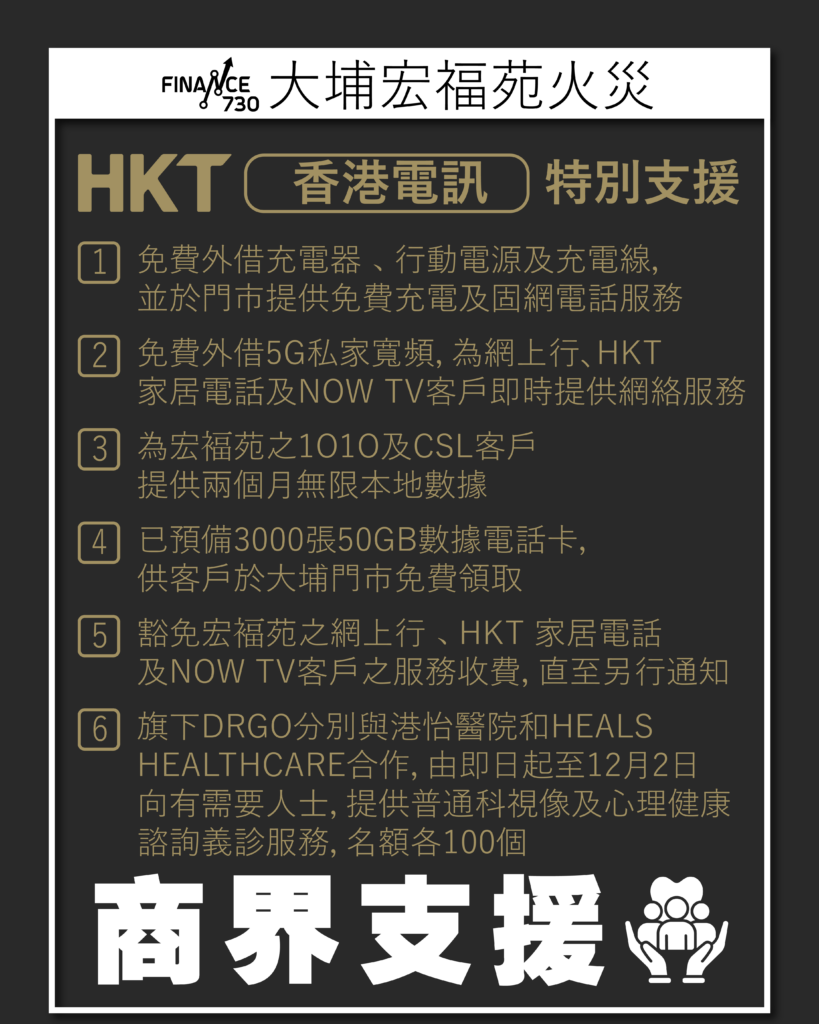 香港電訊宣布,為協助大埔宏福苑火災受影響客戶,已推出多項支援措施。