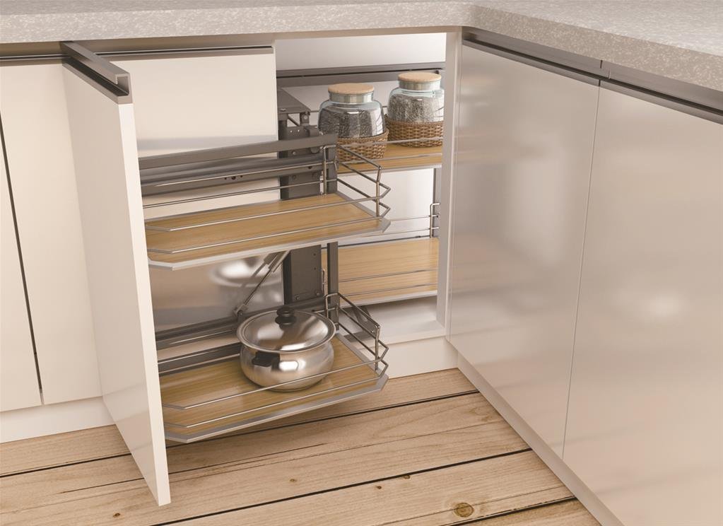 - 轉角拉籃:通常用在廚房地櫃的轉角位置,轉角拉籃的使用方法就是將轉角位置的可使用的空間,直接拉出來使用,可以輕易地使用轉角空間,但安裝要求整個轉角的位置沒有任何水喉或煤氣喉去阻擋。