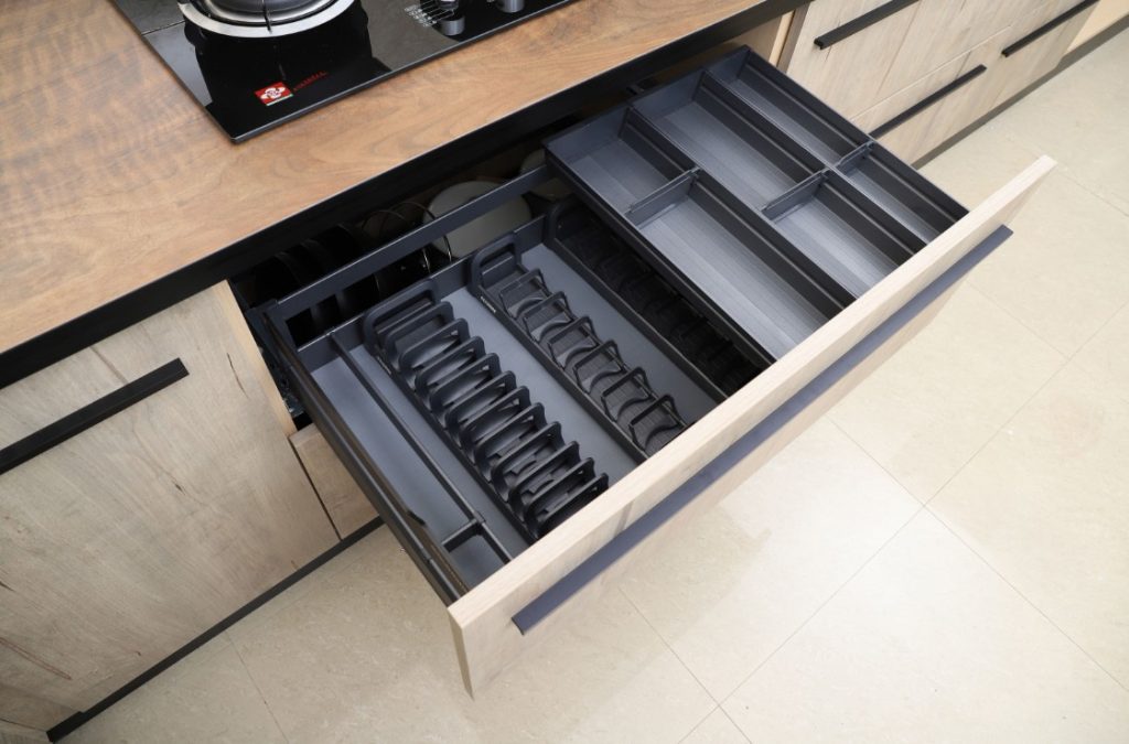 - 筷子架:通常會以一個櫃中櫃的形式進行,就是碗碟拉籃中的筷子架,筷子架是一個比較淺的小櫃桶,有時候會放在一個拉籃入面。