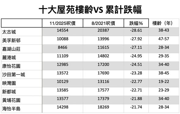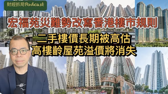 宏福苑災難也讓我們重新審視高樓齡物業的結構問題。最新的樓市數據顯示,今年11月和2021年8月的歷史高位樓價比較,太古城和美孚的樓價跌幅分別達到28%和27%。而對於樓齡相對較新的物業,例如映灣園和新都城,其樓價跌幅相對較小。此外,高樓齡物業的按揭年期會縮短,這強調了該問題的迫切性。