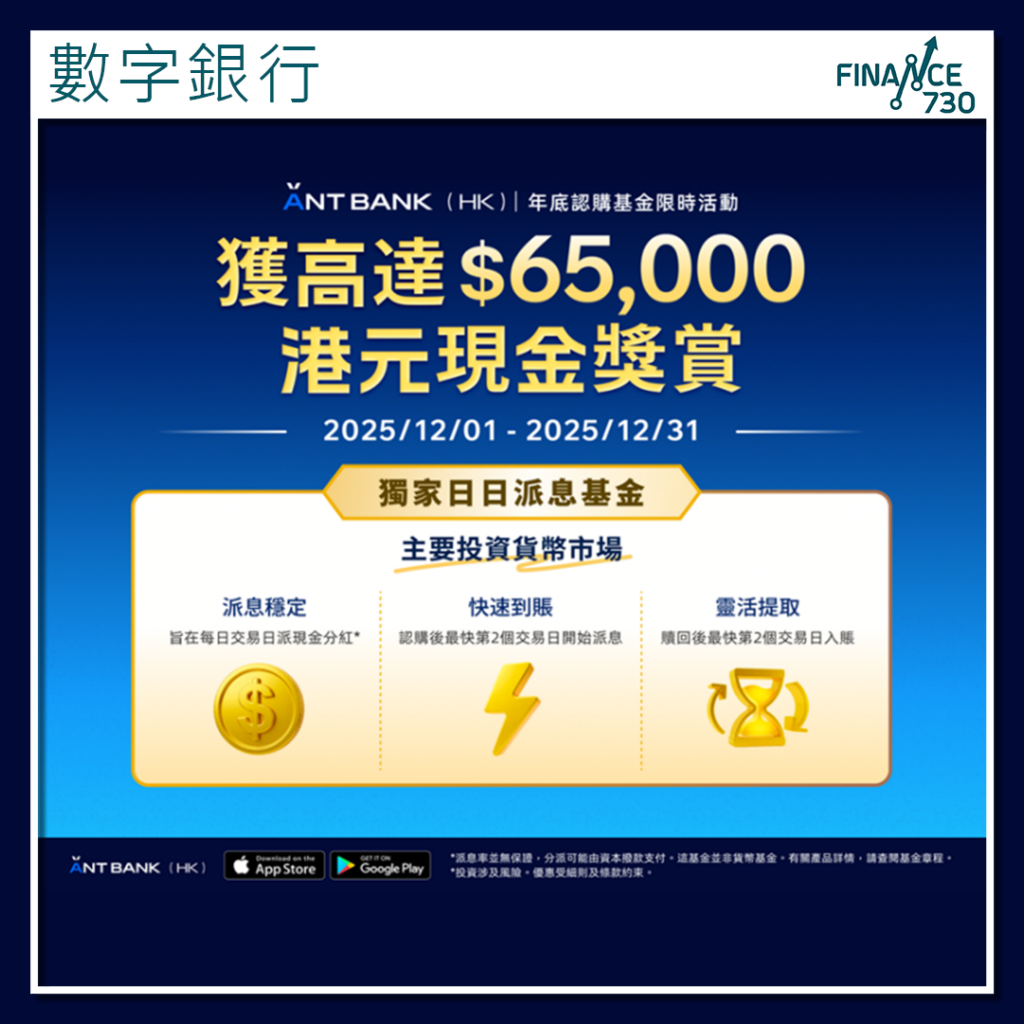 客戶可透過AlipayHK內的螞蟻銀行小程序,或螞蟻銀行官方應用程式認購該基金。螞蟻銀行表示,12月內參與投資基金現金獎賞推廣活動的客戶,最高可獲65,000港元現金獎賞。