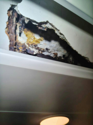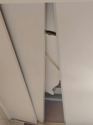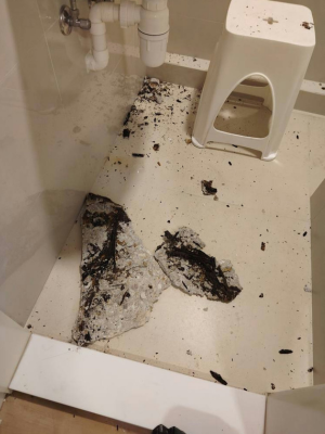 事源有新任業主在Facebook的「公屋討論區」群組發文,指自己剛斥資二百多萬購入一個公屋單位,收樓僅約十天,尚未開始任何裝修工程,便赫然發現廁所天花有石屎塌下。從業主分享的相片可見,單位牆身及裝修看似新淨,但廁所的假天花已被塌下的石屎砸開,露出一個大洞。地面上散落著多塊已發黑、發霉的石屎碎塊,其中幾塊體積巨大。
