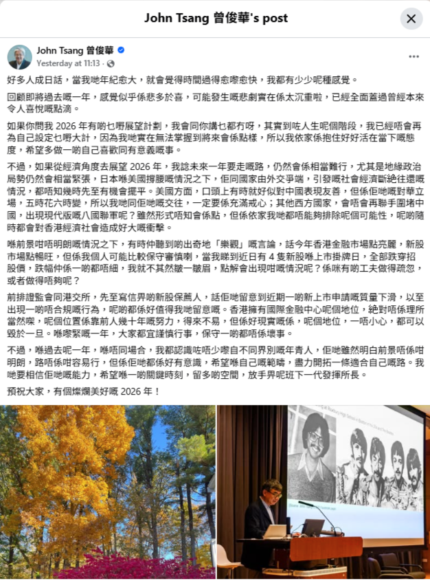 財政司長陳茂波昨日在網誌中總結2025年香港經濟表現,展望2026年,陳茂波料香港經濟可保持良好勢頭。不過前財政司長曾俊華則在社交媒體撰文指,「如果從經濟角度去展望 2026 年,我諗未來一年要走嘅路,仍然會係相當難行…喺前景咁唔明朗嘅情況之下,有時仲聽到啲出奇地「樂觀」嘅言論」。