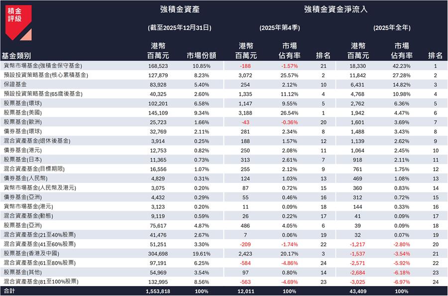 數據顯示,去年香港及中國股票基金為表現最佳的資產類別,但全年卻出現顯著淨流出。相反,表現最弱的強積金保守基金反而吸引超過42%的全年淨流入,成為最受歡迎類別。