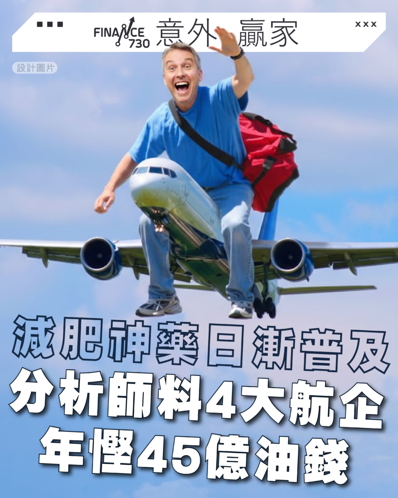 隨著減肥藥物使用率上升,投行Jefferies本月發表研究報告指,乘客平均體重下降10%可使飛機總重量減少約2%,繼而使燃油成本降低約1.5%,推算美國航空(AAL)、達美航空(DAL)、西南航空(LUV)及聯合航空(UAL)會因為旅客體重下降將為航空公司節省燃料開支,估計四大航企每年可合共節省5.8億美元成本,繼而使航空公司的每股收益(EPS)得以提升。