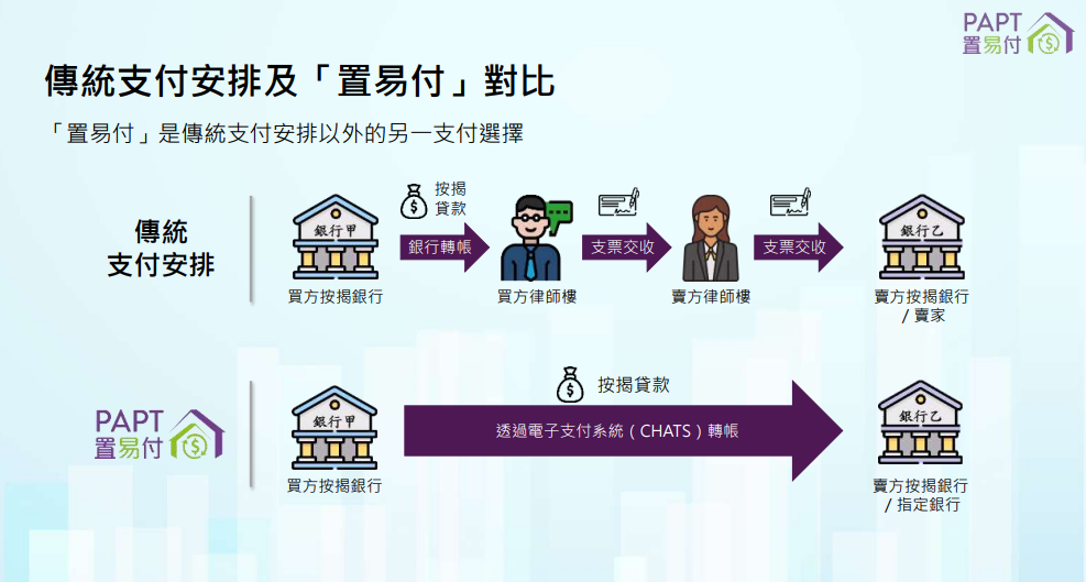 在「置易付」安排下,買方的按揭貸款款項會透過銀行之間的港元即時支付結算系統(CHATS)直接轉賬至賣方銀行╴資金毋須經過律師樓託管賬戶。