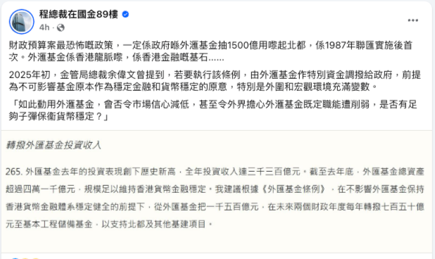就住相關政策,財經KOL「程總裁在國金89樓」形容「財政預算案最恐怖嘅政策,一定係政府喺外滙基金抽1500億用嚟起北都,係1987年聯匯實施後首次。外滙基金係香港龍脈嚟,係香港金融嘅基石……」
