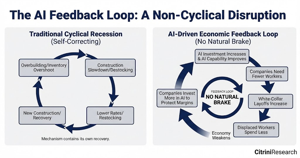 Citrini Research題為《2028年全球智能危機》(The 2028 Global Intelligence Crisis)研究報告可謂一石激起千重浪。雖然報告明確聲明這並非預測,而旨在模擬一個「AI過度成功反而導致經濟災難」的假想情景以引發思考,但在Michael Burry等投資者轉發加持下,報告短時間內在社交媒體以病毒式擴散,並進入主流投資圈視野。