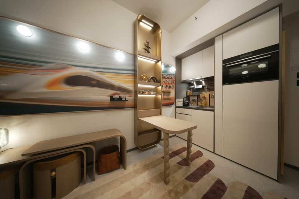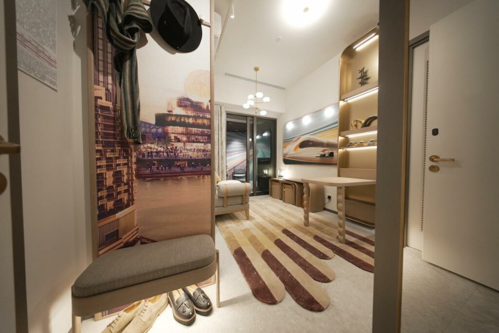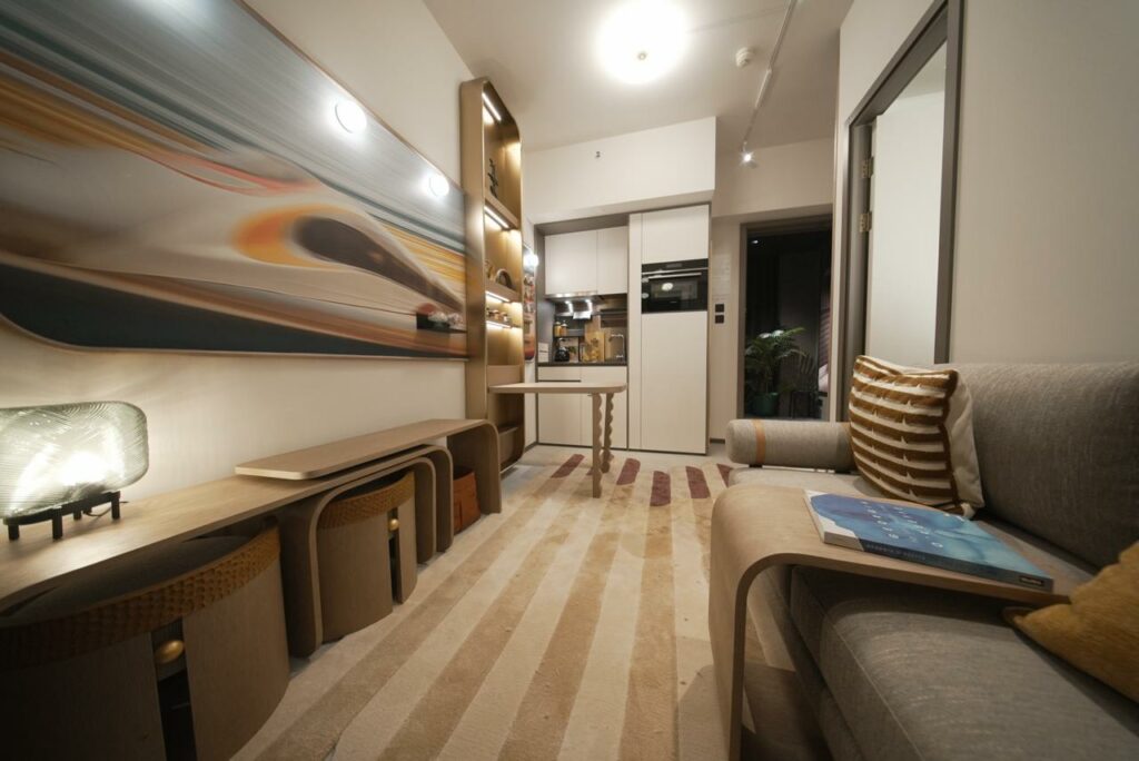 毗鄰港鐵高鐵西九龍站、以「雙城生活」為概念的尖沙咀新盤瑧玥(GRAND AUSTIN BOHEMIAN)今已裝飾無改動示範單位參照18樓B單位搭建,實用面積266平方呎,屬一房間隔,層與層之間高度最高可達3.15米。